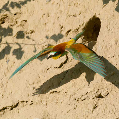 Tôt le matin ce Guêpier d'Europe sort de son terrier pour nourrir sa petite famille