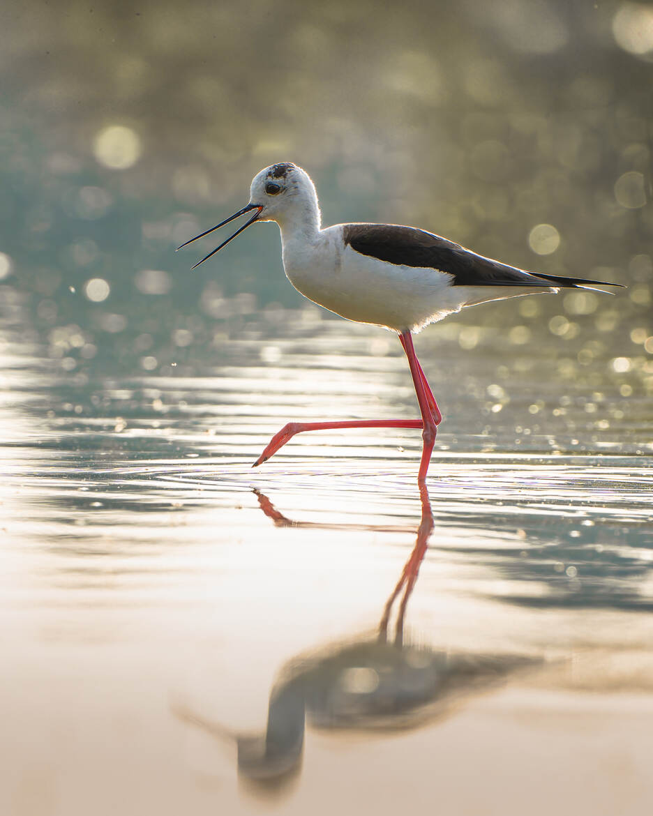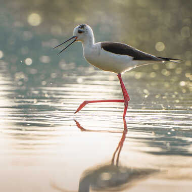 L'échasse blanche est sans doute l'oiseau le plus grâcieux de nos marais... avec ses pattes interminables et son air délicat. J'ai voulu faire cette photo en contre-jour, au lever du soleil semi-voilé, et au ras de l'eau pour avoir les reflets lointains du soleil sur les vaguelettes, qui créent ces jolies bulles de bokeh aux couleurs chaudes.