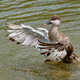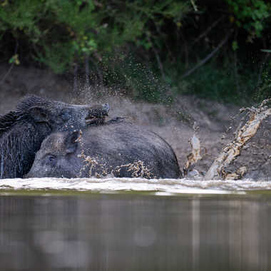 Deux sangliers mâle s'affrontent dans un étang en fin de journée.
