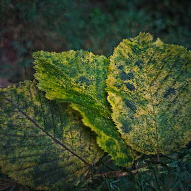 Des feuilles mortes que j'ai ramassé. Je me pose la question si l'arbre est malade, en cette saison. En tout cas c'est une coloration changeante avec une apparition des nervures.