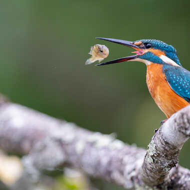 Martin pêcheur avec sa proie fraichement sortie de l'étang, une petite perche arc en ciel qu'il lance et rattrapera par la queue avant de l'assommer en la frappant sur la branche.
