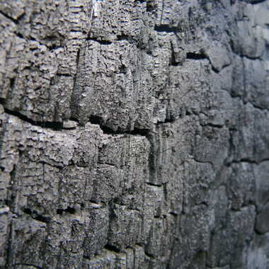 Un arbre complètement cramé en gros plan sur les structures et sculptures crées par ce tronc carbonisé.