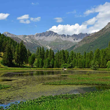 Situé à 1850 mètres d’altitude, le lac de Roue se love au cœur d’un décor somptueux, qui n’est pas sans rappeler les mythiques et majestueuses montagnes Rocheuses du Canada. Il est l’un des deux seuls lacs du Queyras à se situer dans une forêt de mélèzes. Seul se détache, dans le ciel, le Pic de Rochebrune.