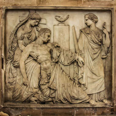 Une femme, la Religion, soutient le duc mourant; à droite, la Justice tient glaive et fléau; au centre une stèle ornée de la palme du martyre, porte une lampe allumée.