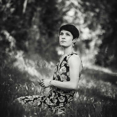 Dans la quiétude d’une clairière, une silhouette se laisse envelopper par la lumière tamisée des arbres. Le noir et blanc transcende les couleurs pour ne garder que l’essentiel : la douceur d’un instant suspendu. Assise dans l’herbe, vêtue d’une robe fleurie, elle semble appartenir à la nature elle-même, comme une fleur parmi les fleurs. Son regard, tourné vers le ciel, laisse deviner une pensée lointaine, une rêverie intérieure. La lumière caresse son visage et souligne la fragilité de l’instant, entre ombre et clarté. Cette photographie capture non seulement une présence, mais aussi un silence, une respiration, un dialogue secret avec la forêt.