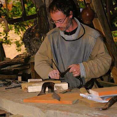 Ça s'active de toutes parts ! Échafaudages, remparts, ateliers. Ici on extrait des pierres d'une carrière locale, là bas on taille des charpentes, plus loin le bûcheron scie du bois, tandis qu'un cheval tracte des matériaux...Tout ça en habits médiévaux.