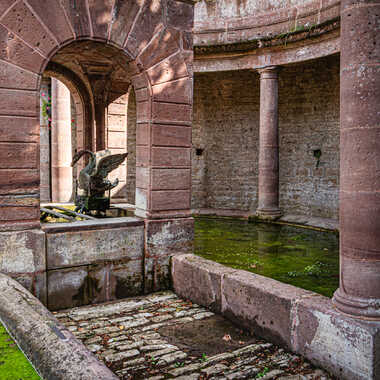 En grès rose, en hémicycle à portique soutenu par une rangée de colonnes. Bassin en demi-cercle et abreuvoir rectangulaire.