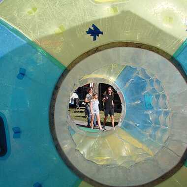 Fête foraine dans la ville avec des attractions nouvelles : gros ballons sur un plan d'eau à l’intérieur desquels les utilisateurs marchent et créent des collisions.