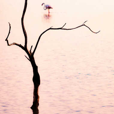 Un matin , le regard se pose , un arbre mort, un flamant rose, des salines en Espagne.