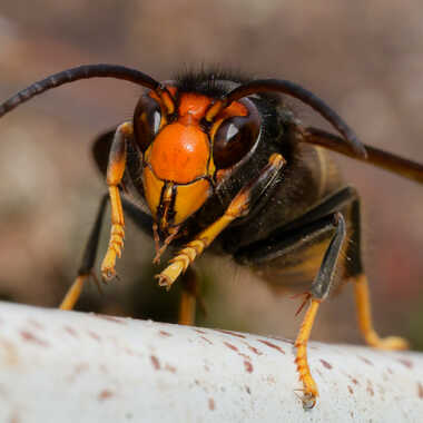 Frelon asiatique qui s'attaque aux abeilles en se positionnant devant la ruche.