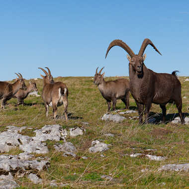 La harde avec son patriarche sont venu se régaler d'herbe tendre dans un alpage d'altitude et pas farouches ils s'approchent si on reste tranquille.