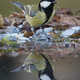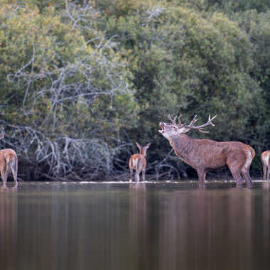 Grand cerf bramant dans un étang entouré de son fan club, une petite harde de biche.