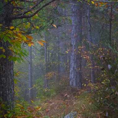 Un agréable sentier plongé dans le brouillard matinal d'une très belle forêt composée entre autres de chênes blancs, châtaigniers et pins.