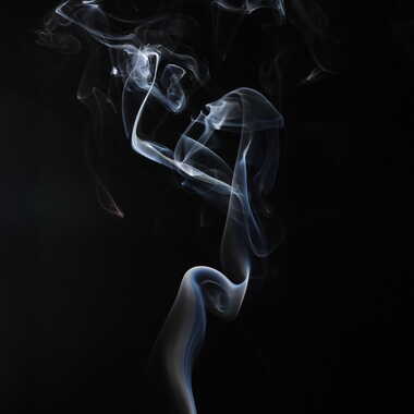 Fumée d'encens photographiée devant un fond noir et avec un flash placé derrière sur le côté.