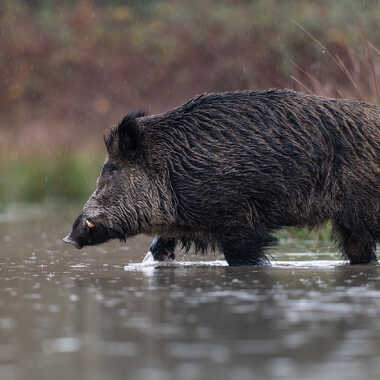 Un gros sanglier mâle traverse un petit chenal sur la queue d'un étang.