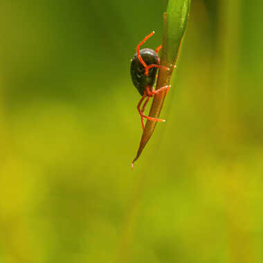 Acarien des moissons sur une fleur de mousse. Ce n'est pas son habitat de prédilection, il est souvent sur les feuilles de graminées !