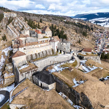 La chateau de Joux et son fort de Mahler en arrière plan. La Cluse et Mijoux. Haut Doubs. Photo prise en drone dji mini 4pro.
