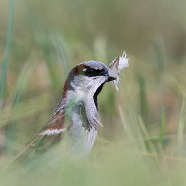 Moineau mâle préparant un nid douillet pour sa promise en collectant des plumes au sol.