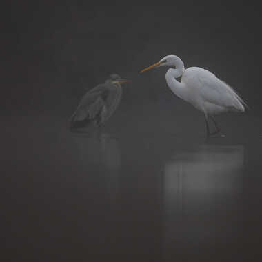 Grande aigrette et héron cendré photographiés au lever du jour un matin de brumeux