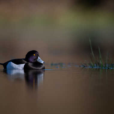 Fuligule Morillon mâle photographié dans une lumière rasante de fin de journée.