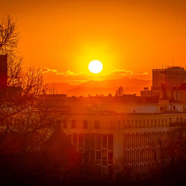 Un superbe coucher de soleil d'hiver au dessus de la ville de Strasbourg.