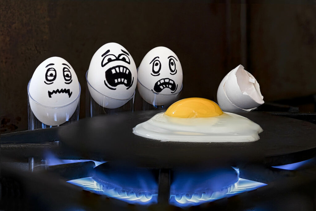 Je ne sais pas si tu l’as fait exprès, mais , en plus des mimiques apeurées des oeufs, les reflets des flammes bleues sur les coquetiers transparents donnent l’impression qu’ils pleurent …