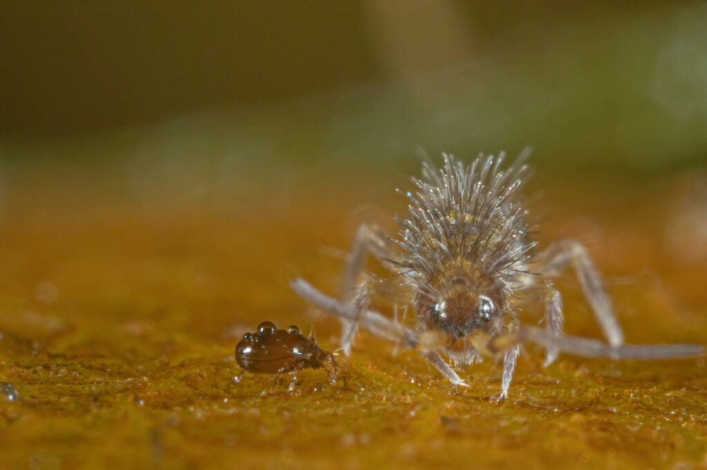 Un Collembole poilu et un acarien se rencontrent sur une feuille tombée. L'acarien mesure 0.4mm!