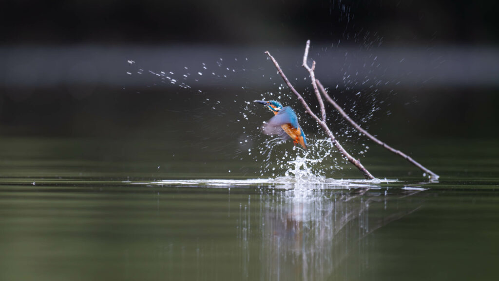 Martin pêcheur s'extirpant de l'étang suite à un vol stationnaire suivi d'un plongeon.