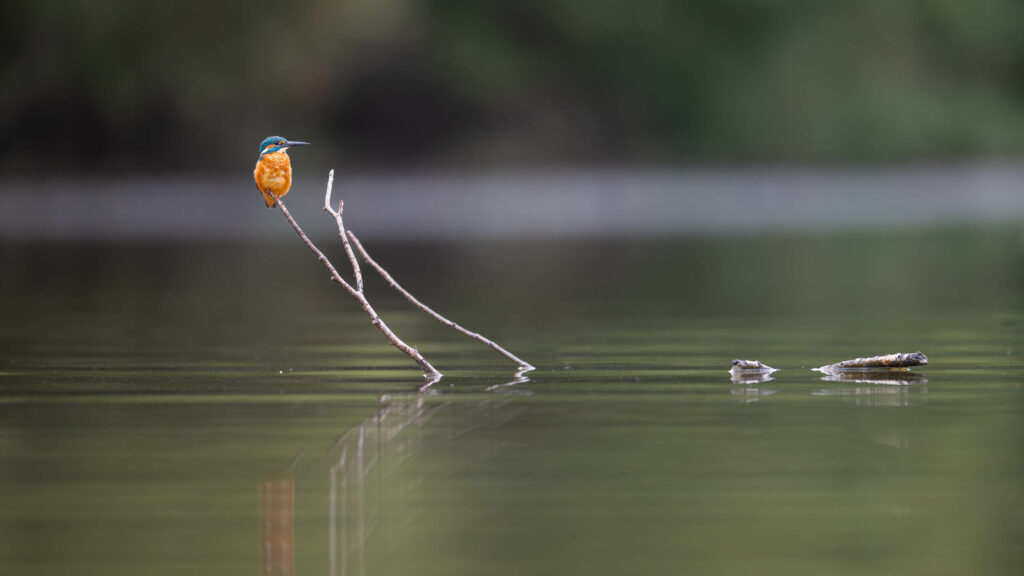 Martin pêcheur sur son perchoir perdu au milieu de l'étang.