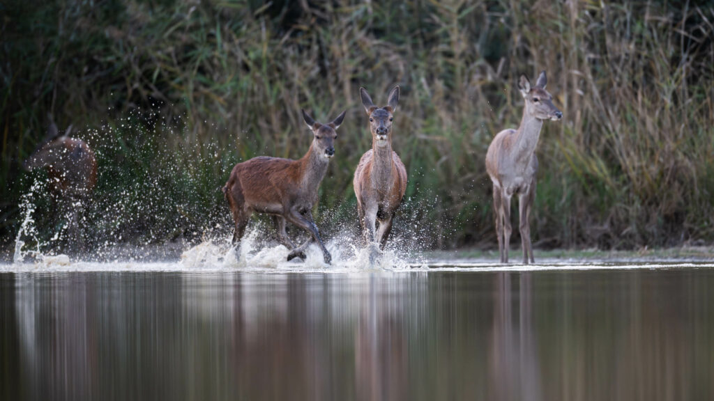 Deux faons courent sautent et jouent sur l'étang sous la surveillance de leurs mères.