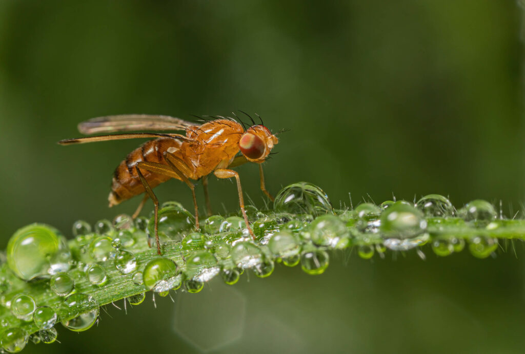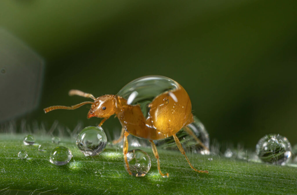 En passant sous une autre feuille, une goutte lui est tombée dessus.