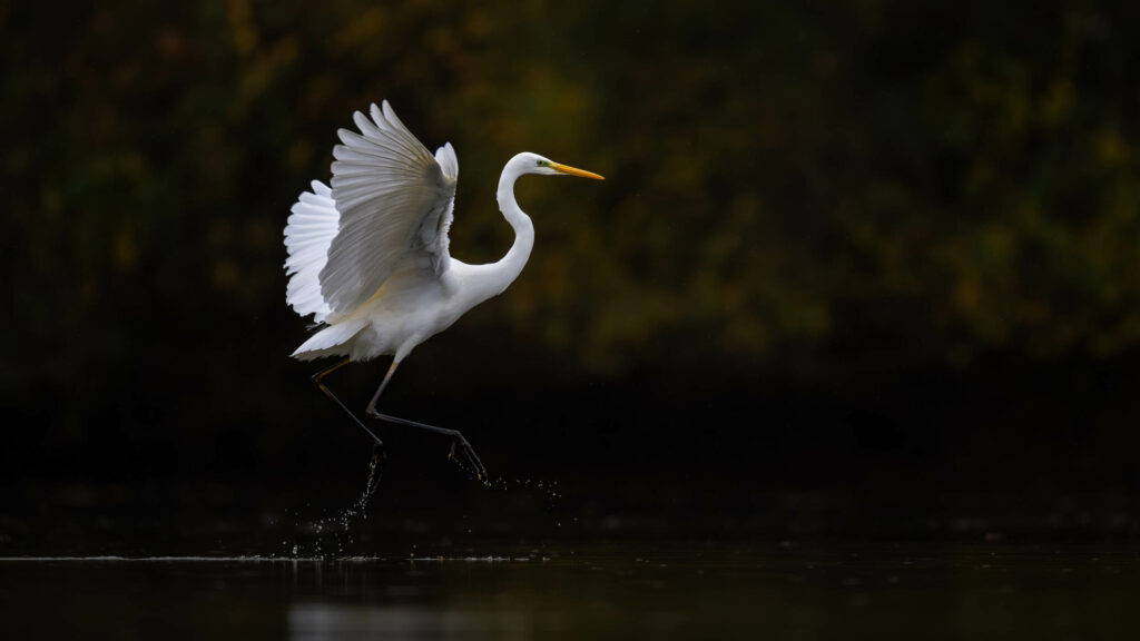 Grande aigrette photographiée courant sur l'étang au lever du jour